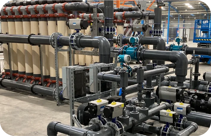 Procédé membranaire disposant d’une membrane aux pores de 0,01 à 0,1 micron, son rôle est de retenir toutes les bactéries, les virus, les silices colloïdales, les émulsions d’huile dans l’eau grâce aux modules UF à fibres creuses ou tubulaires.